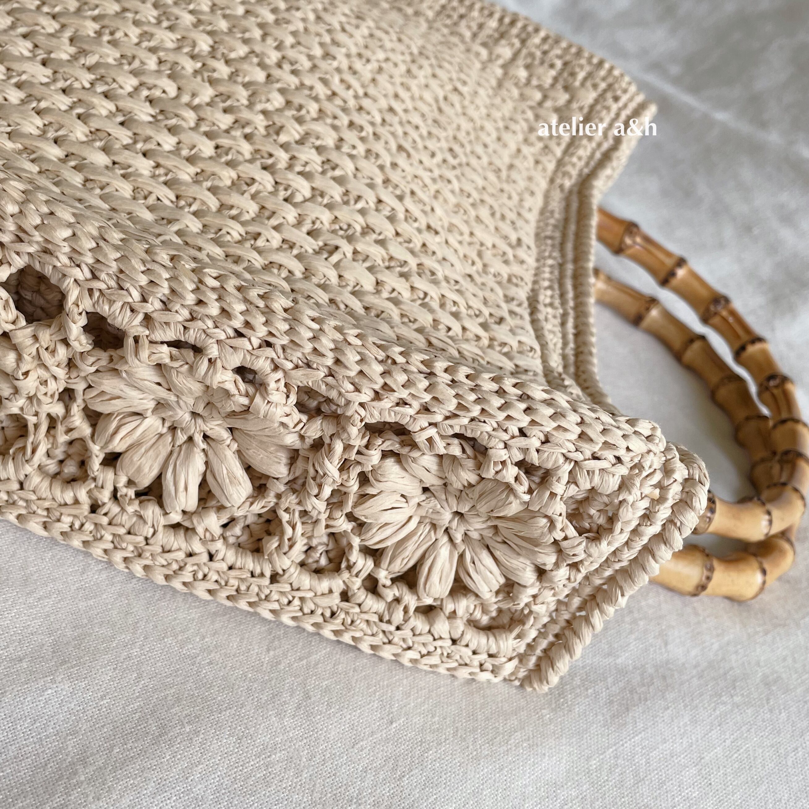 マーガレットモチーフのバンブーハンドルバッグ マニラヘンプヤーン ミルクカラー