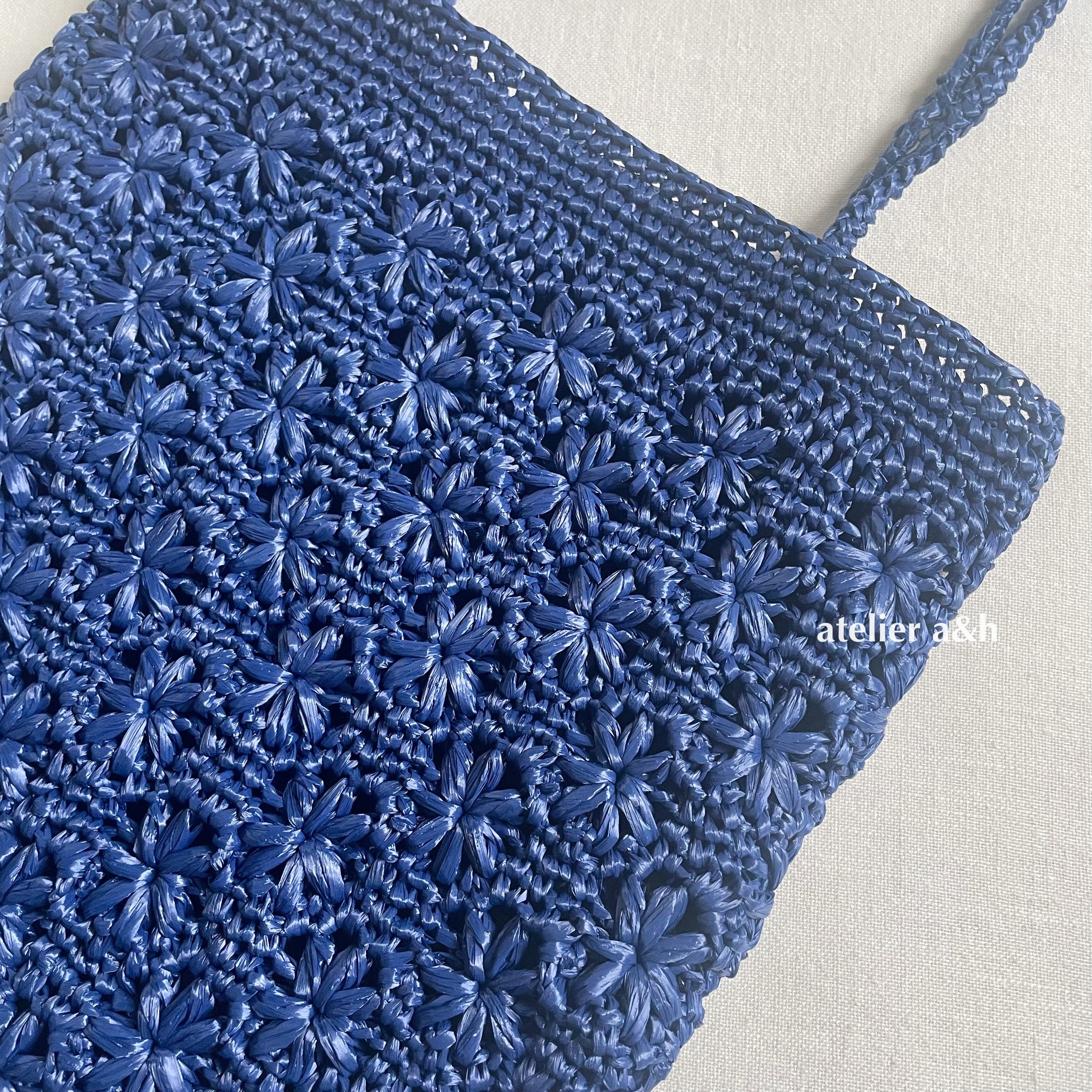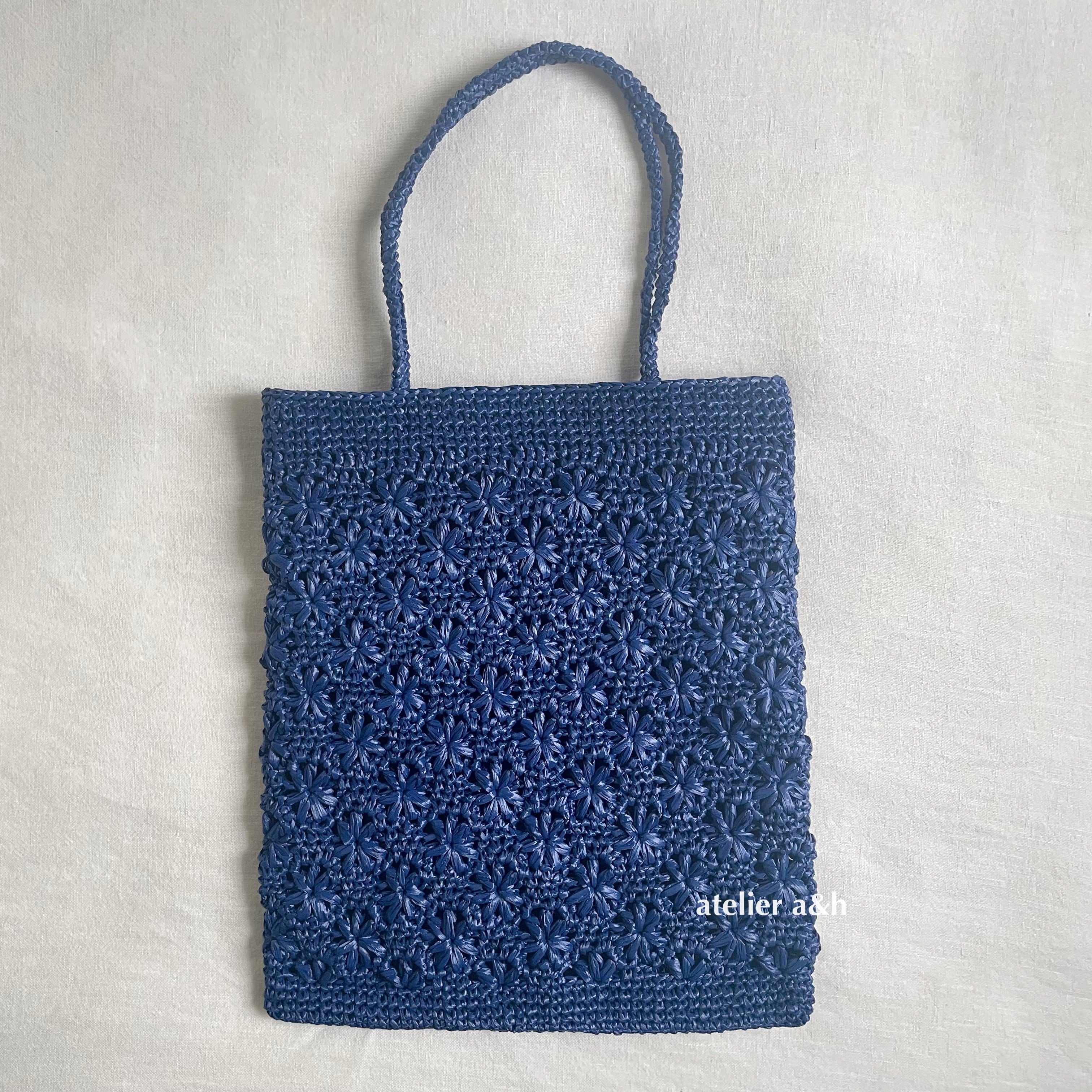 エコアンダリヤで編んだ 花模様編みのぺたんこバッグ ネイビー