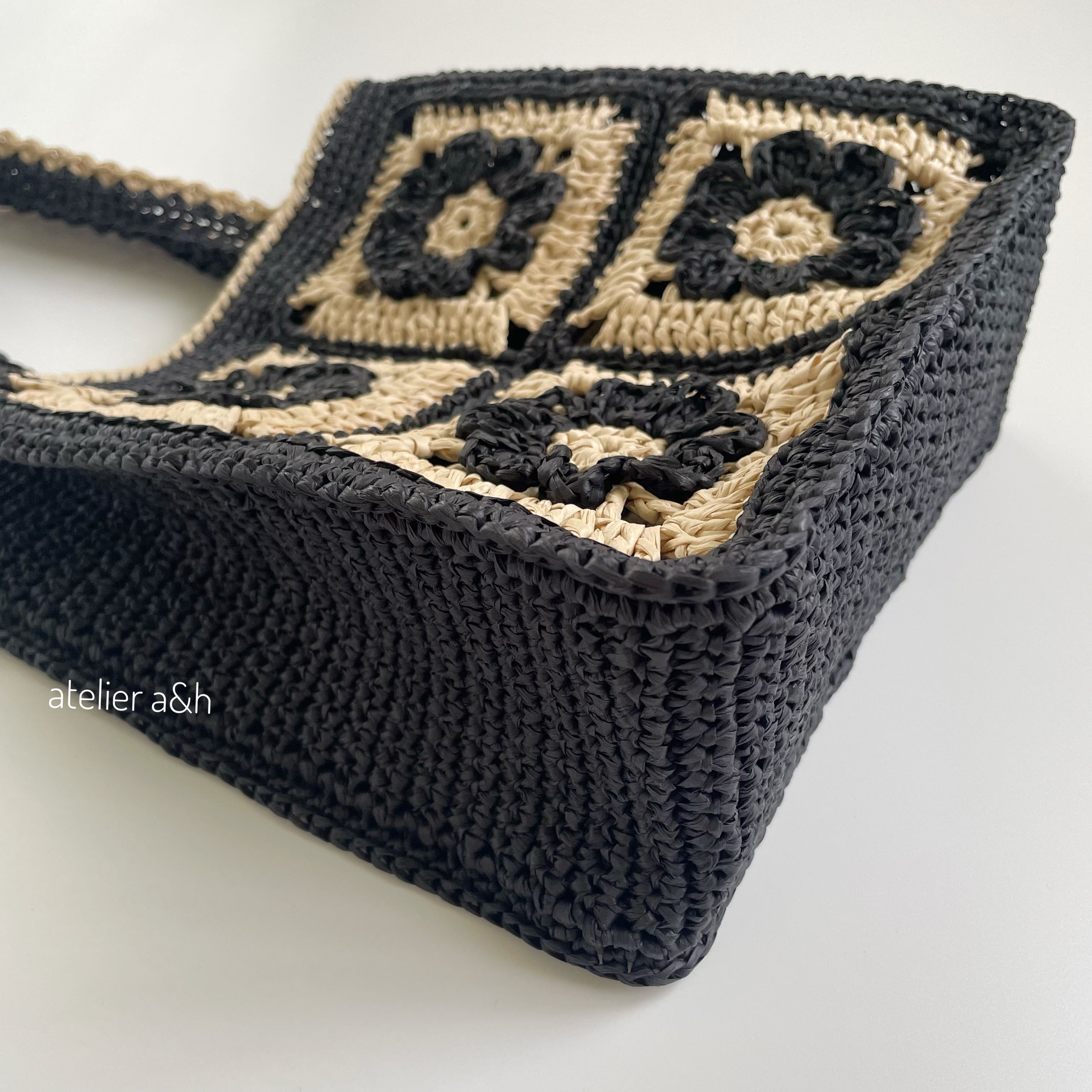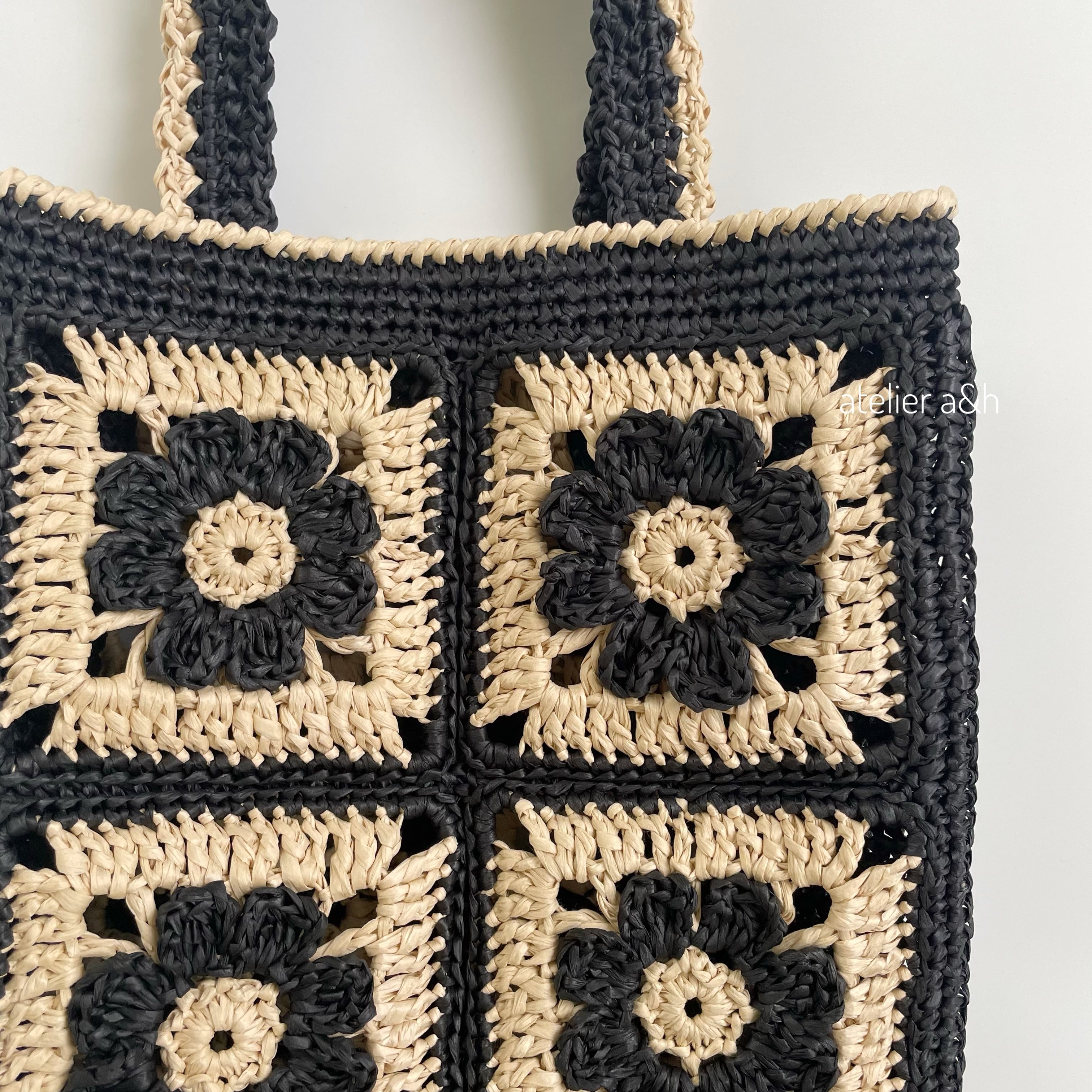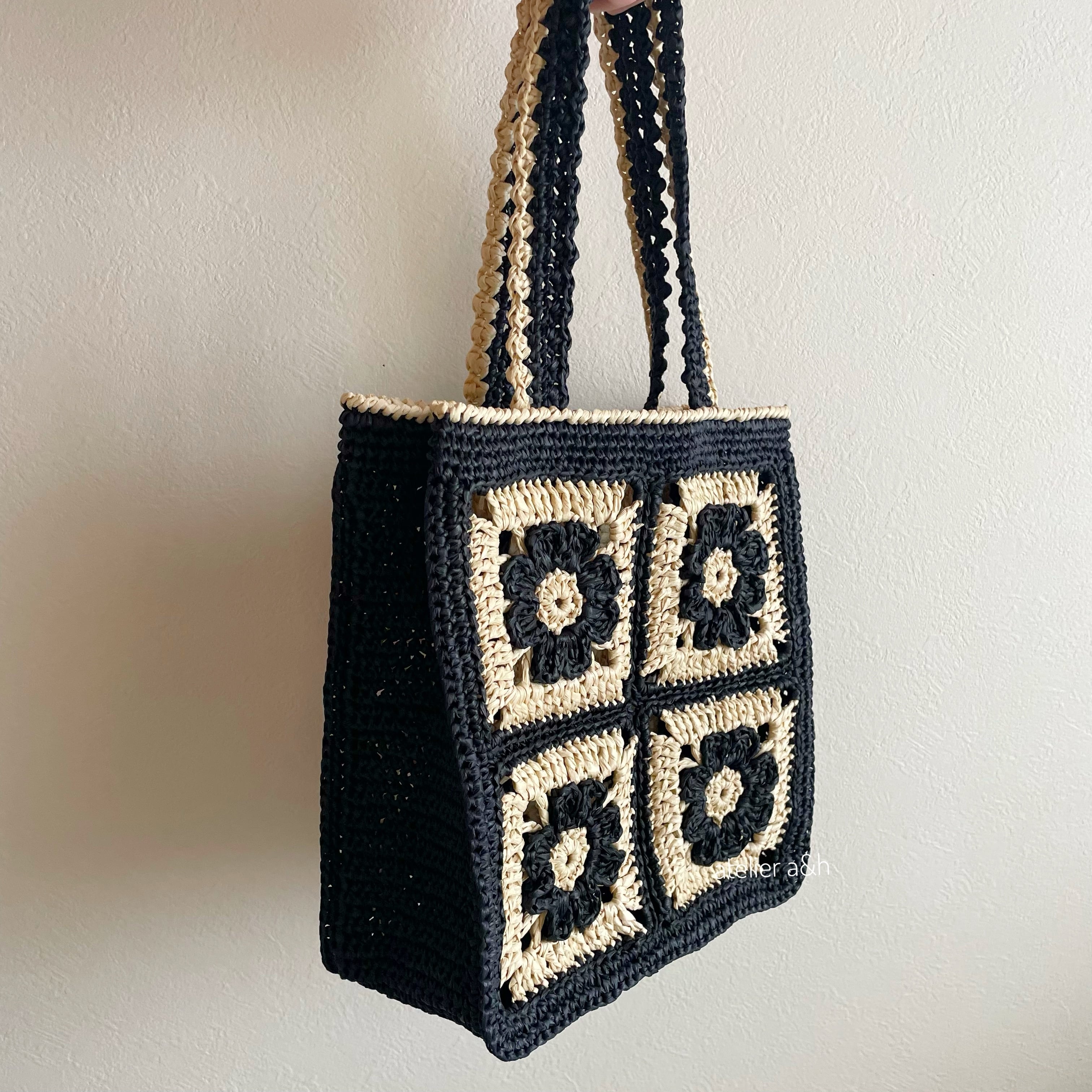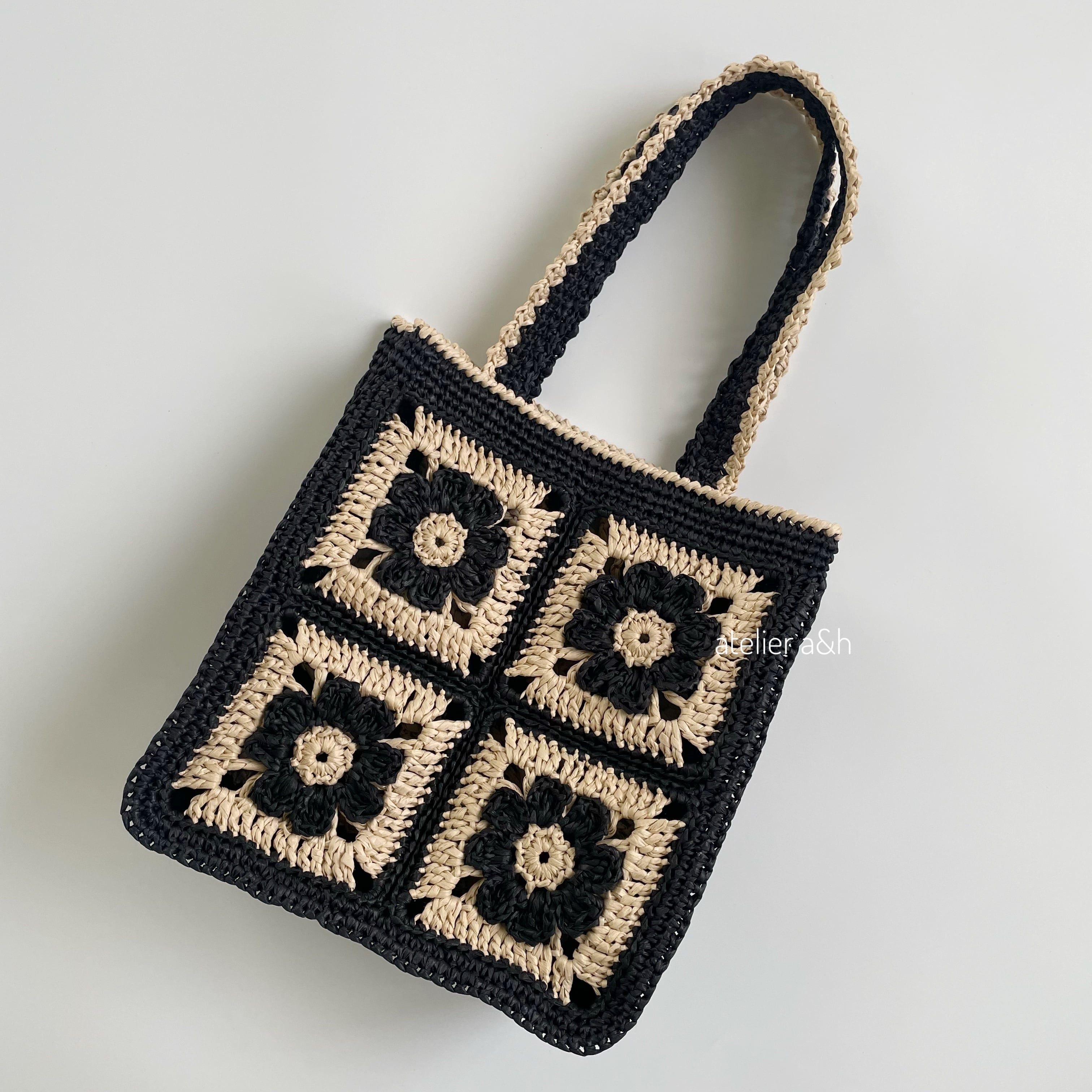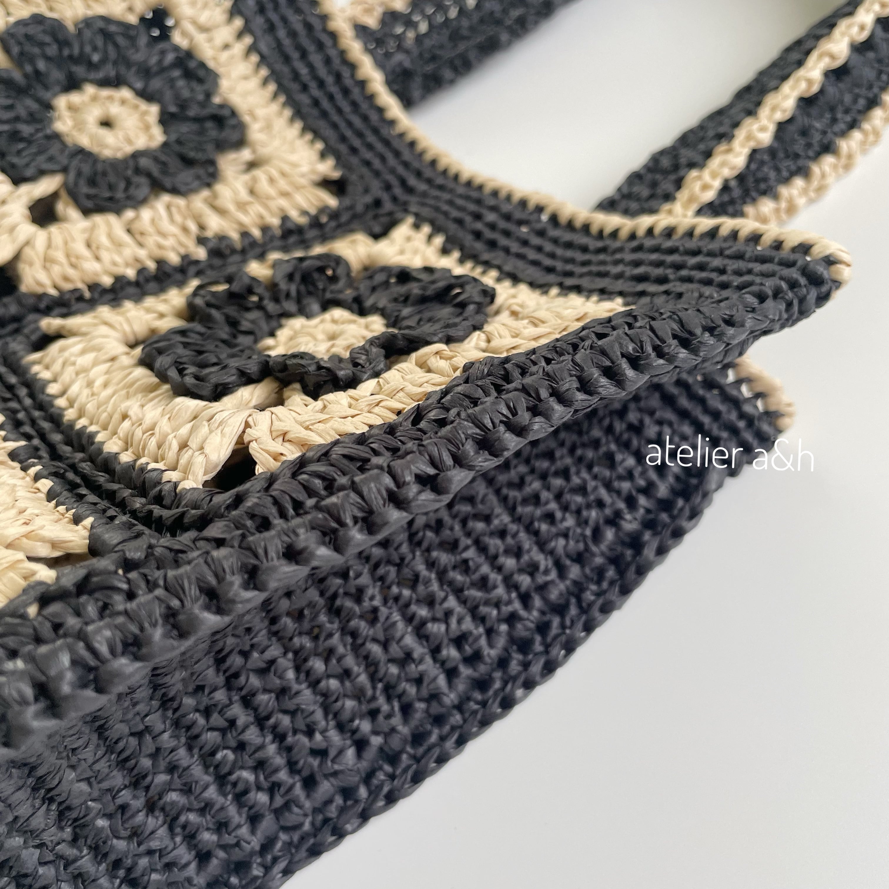 かごバッグ✳︎花モチーフのスクエアバッグ ブラック×ミルク