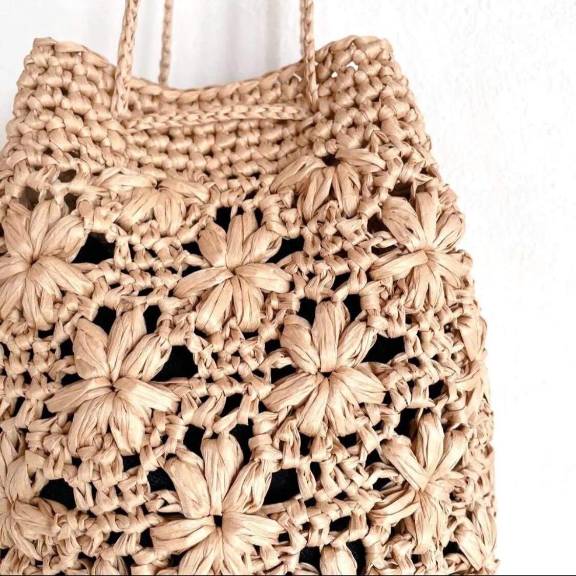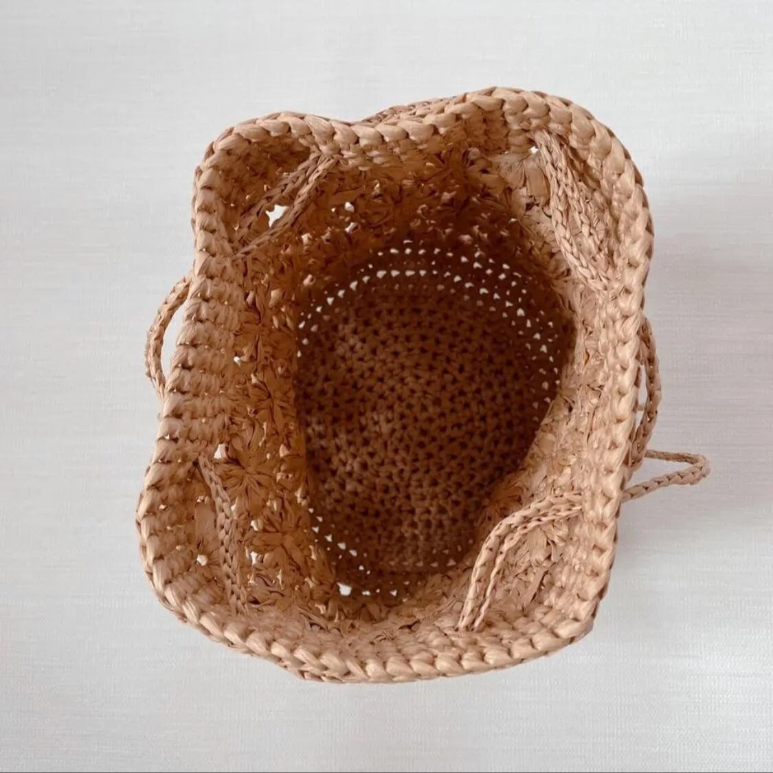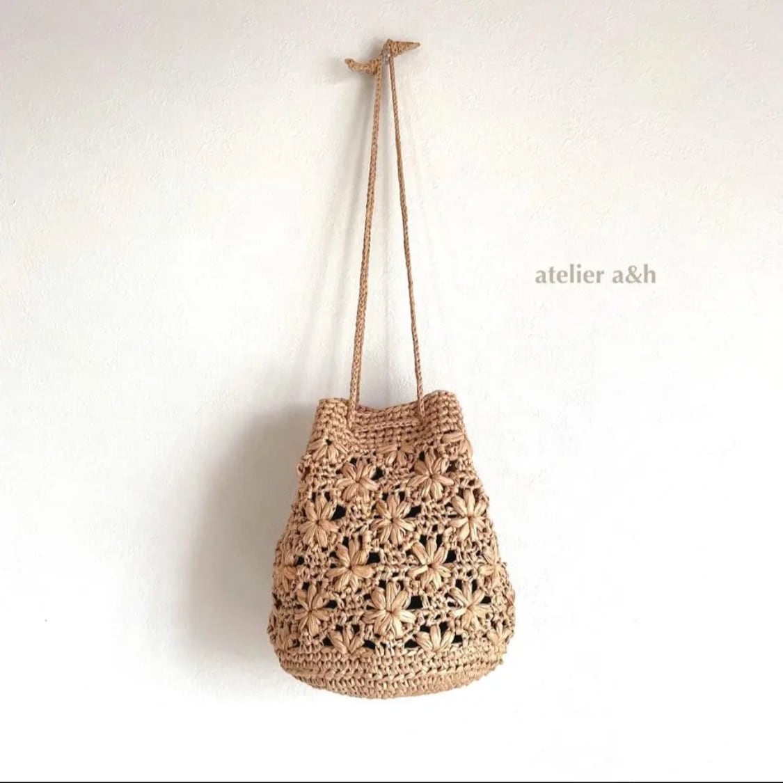 マニラヘンプヤーンで編んだ 花模様のきんちゃくバッグ 小さめサイズ ストローカラー