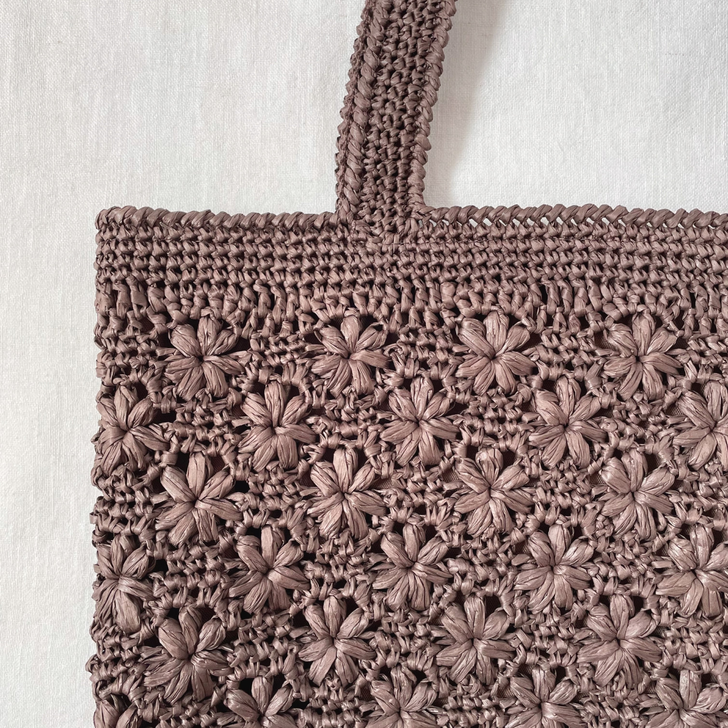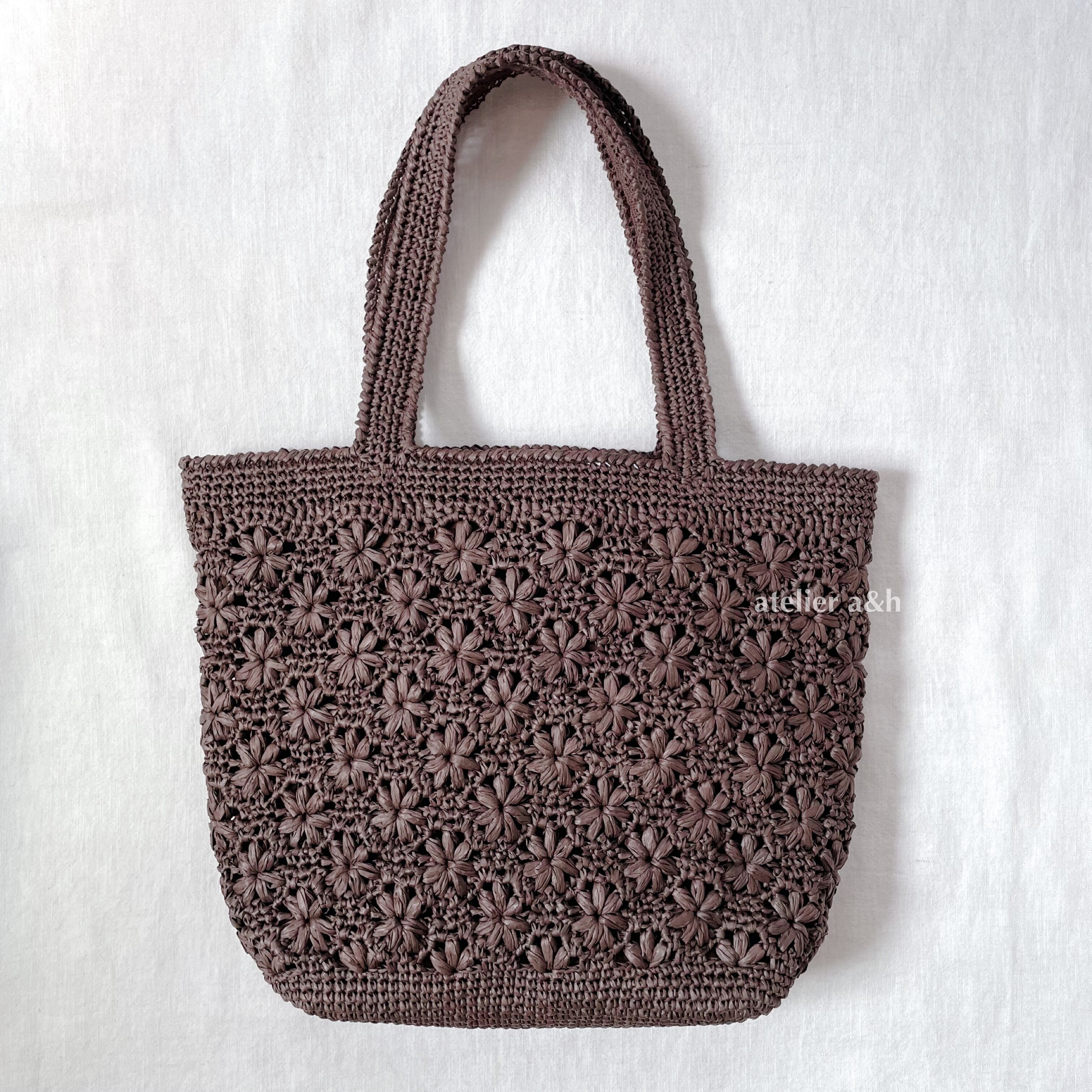 花模様編みのトートバッグ ブラウン 〈持ち手長め〉 かごバッグ