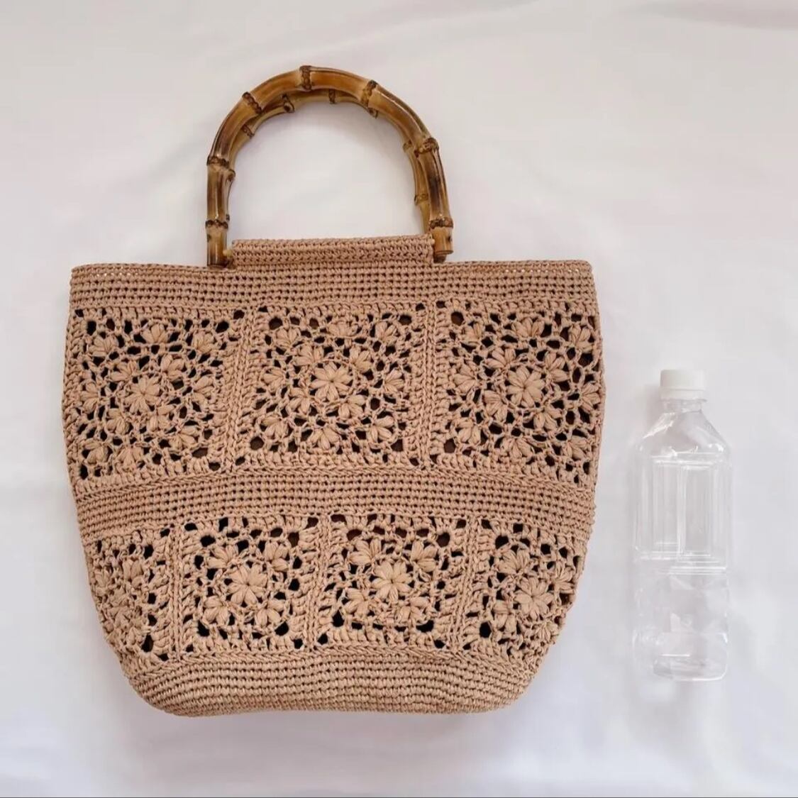 マニラヘンプヤーンで編んだ大きなモチーフバッグ ストローカラー かごバッグ