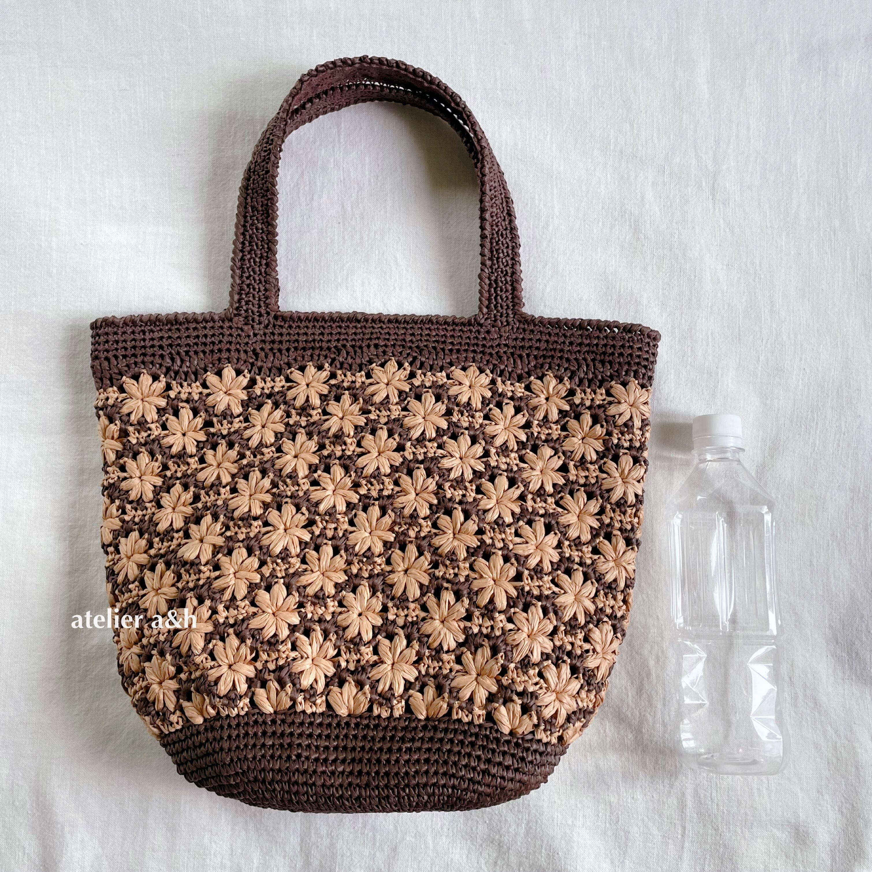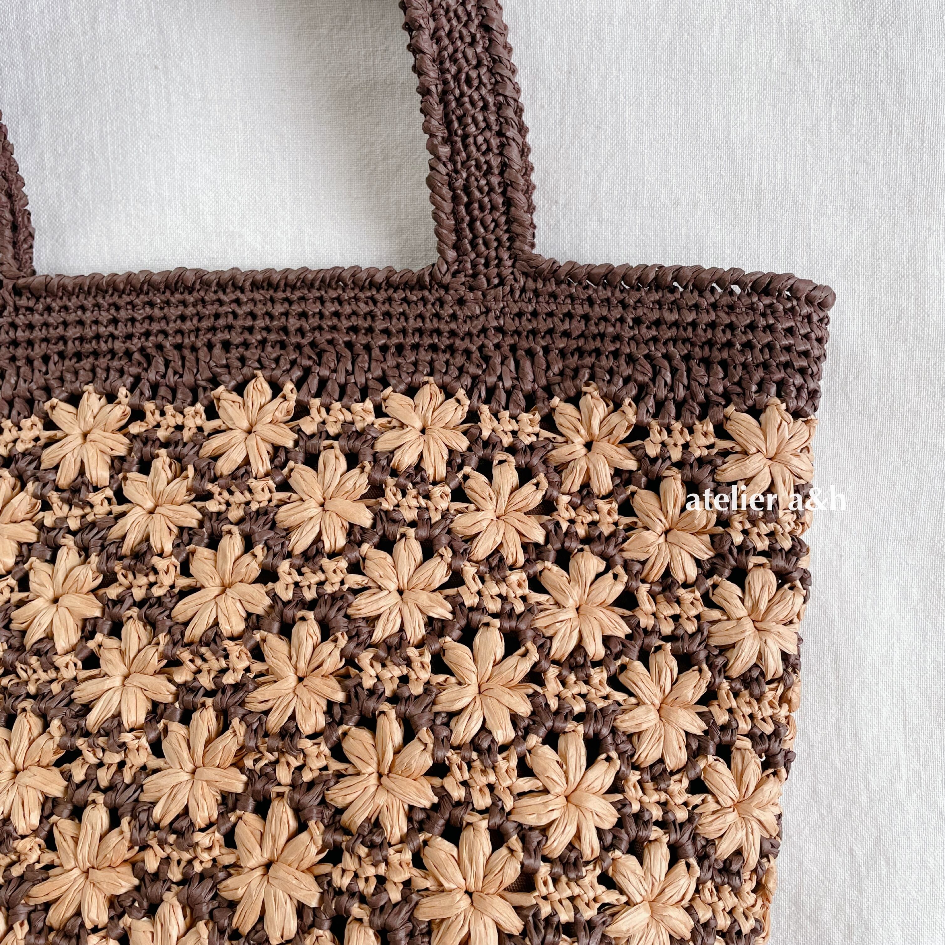 花模様編みのマルシェトートバッグ ブラウン×ストロー〈持ち手短め〉 かごバッグ