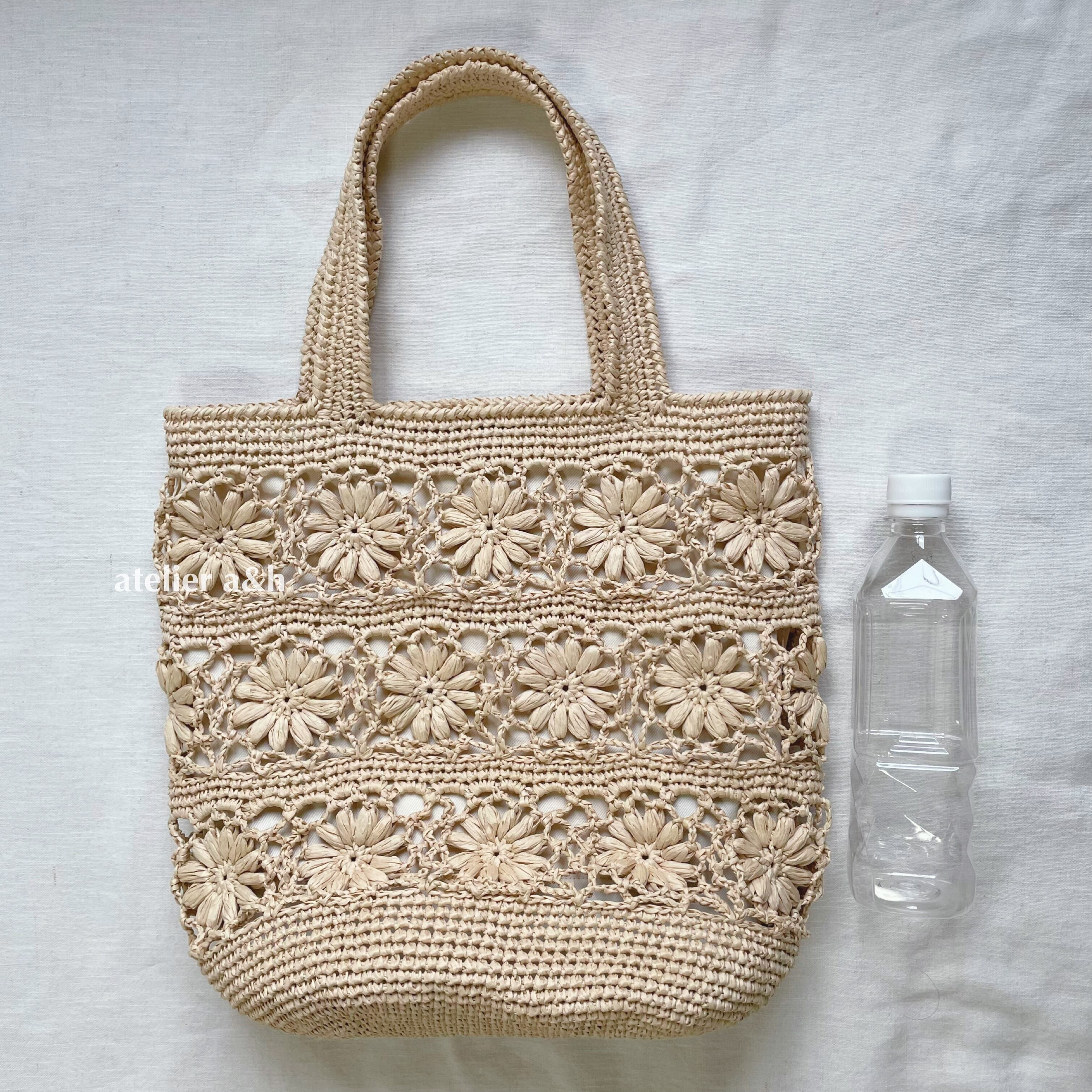 #マルシェバッグ #マーガレットモチーフ #ナチュラル #花模様 #大きめサイズ #麻ひもバッグ #おしゃれバッグ #普段使い#カゴバッグ